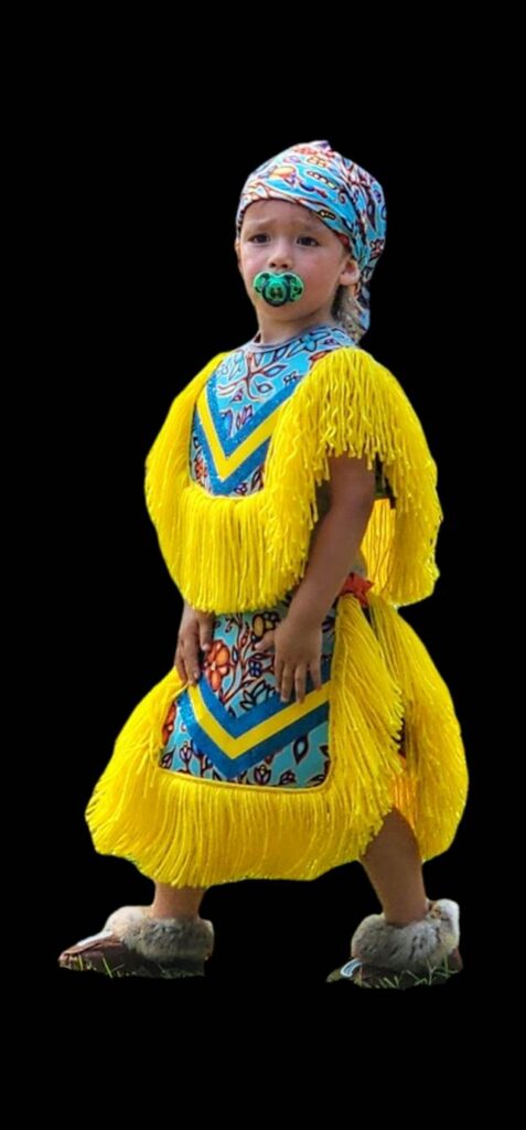 I created and named this regalia Rainbow Sabe for my three-year-old son, Luka Moon. Luka carries the Rainbow Sabe spirit and had the honour of performing in this vibrant regalia at the Peguis First Nation Pow Wow in 2024. The Sabe, often referred to as a “Sasquatch,” is a significant symbol in Indigenous culture, representing the spirit of honesty, and it is associated with the teachings of truth, wisdom, humility and a guardian of integrity while honouring our responsibilities to ourselves, others, and the natural world.
