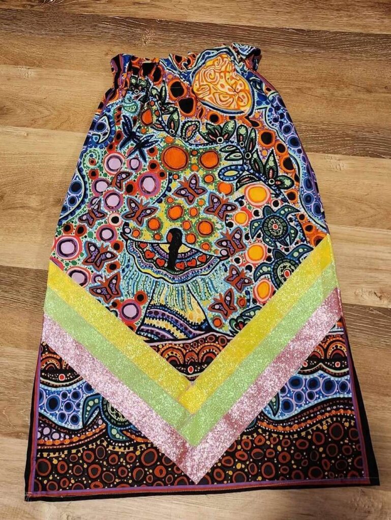 Dance Like a Butterfly is a ribbon dress created for my daughter, Zoey. This dress features a vibrant, rainbow-like palette that reflects her traditional colours and her spirit name, Gentle Speaking Yellow Turtle Woman. The design serves as a reminder for her to move with the grace and elegance of a butterfly, emphasizing the importance of fluidity and poise in her movements.