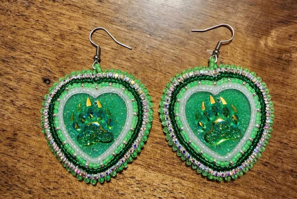 I named these earrings Walking with Courage as a gift for my timid or shy daughter, Lainey. They represent and remind her of the courage she carries as she learns to navigate life as a young lady. Furthermore, the bear paw represents courage, and the colour green is for comfort. It symbolizes growth, hard work, healing, and Earth’s nurturing qualities.