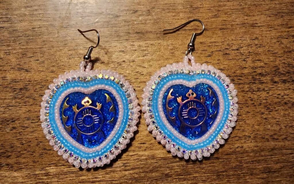 The Whispering Turtles are a pair of beaded earrings designed specifically for my youngest daughter, Zoey. In this design, the turtle symbolizes Mother Earth and wisdom. The background is rendered in a blue hue, which effectively highlights the golden turtles. Additionally, the heart-shaped earrings represent a deep passion for Mother Earth and the wisdom associated with it.