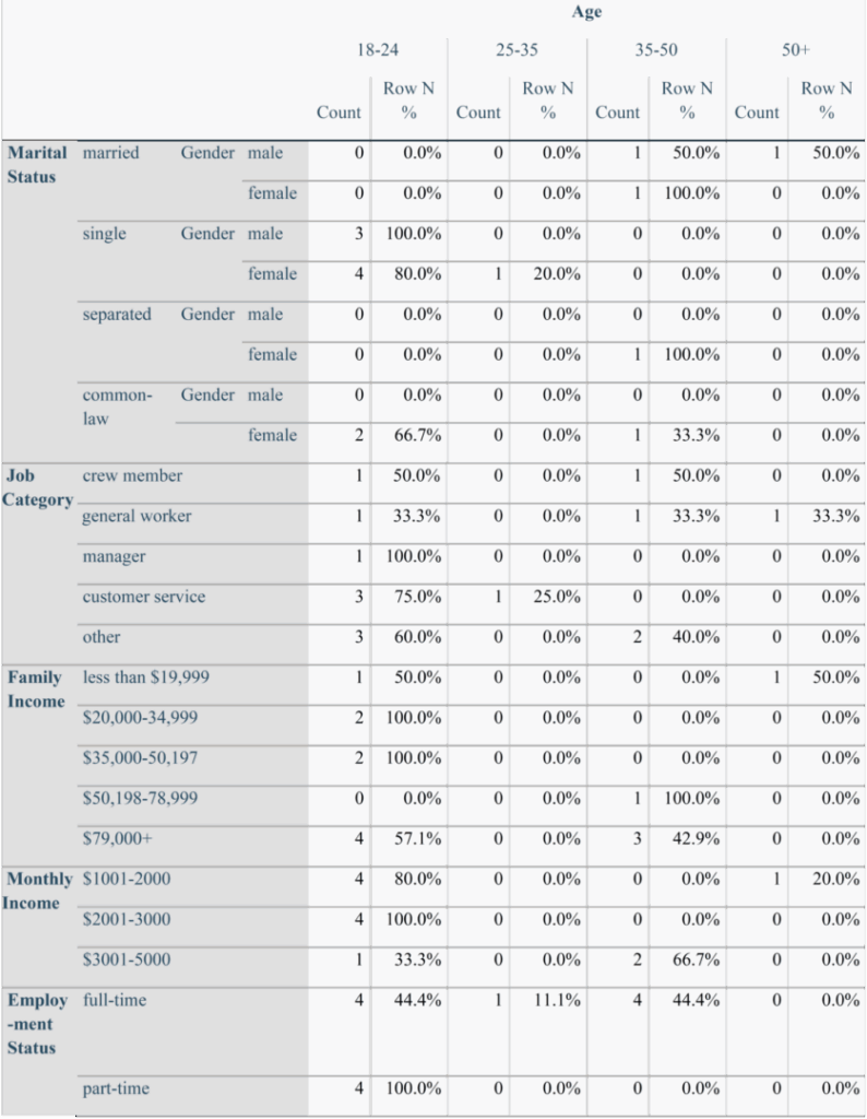 Table 1 shows the range of participant age categories from 18 to over 50, with 60 percent of participants aged 18-24. The table reveals that most participants from the study are single and unmarried self-identified females, with 33.3 percent male participants. Representation in the survey also reaches married, separated, and common-law participants. The job categories included crew member, general worker, manager, customer service, and others, such as administrative assistant and social worker. Also included are the participants’ monthly incomes at work. Participants with a low monthly income may be affected by reduced or part-time hours. Most participants’ household incomes were over $79,000 a year, and the remaining 42.9 percent earned less than around $50,000 per year. In addition, the employment status of each participant shows that 60 percent of participants work full-time compared to 26.7 percent part-time. Lastly, relating to the status of participants, 26.7 percent self-identified as Indigenous. Half the Indigenous participants are recognized as Metis, and the remaining identify as First Nations.